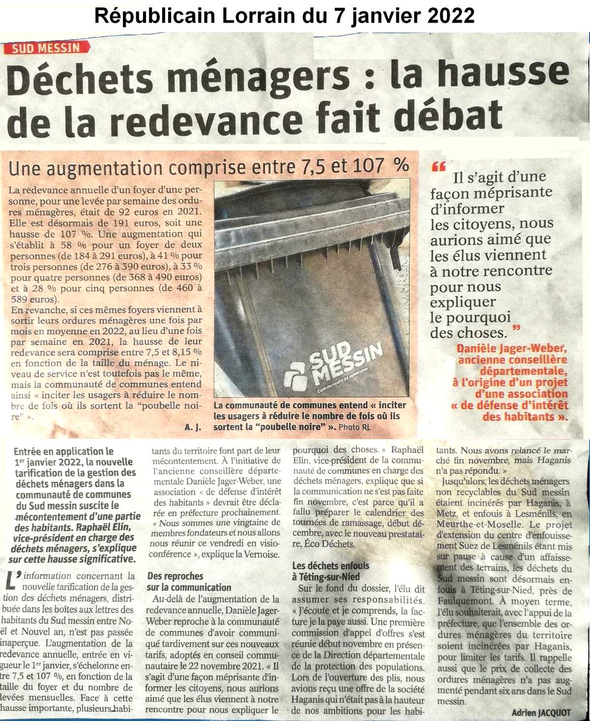 1 >>> Article du Républicain Lorrain du 7 janvier 2022 concernant l'augmentation des tarifs dans le sud messin